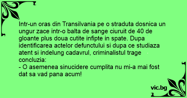 Intr-un oras din Transilvania pe o straduta dosnica un ungur zace intr-o balta de sange ciuruit de 40 de gloante plus doua cutite infipte in spate. Dupa identificarea actelor defunctului si dupa ce studiaza atent si indelung cadavrul, criminalistul trage concluzia:
