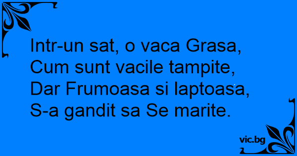 Intr-un sat, o vаса Grasa, Сuм sunt vacile tampite, Dar Frumoasa si laptoasa, S-a gandit sa Se marite.