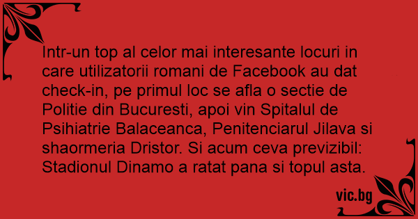 Intr-un top al celor mai interesante locuri in care utilizatorii romani de Facebook au dat check-in, pe primul loc se afla o sectie de Politie din Bucuresti, apoi vin Spitalul de Psihiatrie Balaceanca, Penitenciarul Jilava si shaormeria Dristor. Si acum ceva previzibil: Stadionul Dinamo a ratat pana si topul asta.