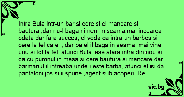 Intra Bula intr-un bar si cere si el mancare si bautura ,dar nu-l baga nimeni in seama,mai incearca odata dar fara succes, el veda ca intra un barbos si cere la fel ca el , dar pe el il baga in seama, mai vine unu si tot la fel, atunci Bula iese afara intra din nou si da cu pumnul in masa si cere bautura si mancare dar barmanul il intreaba unde-i este barba, atunci el isi da pantaloni jos si ii spune ,agent sub acoperi. Re