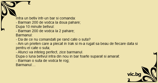 - Am un prieten care a plecat in Irak si m-a rugat sa beau de fiecare data si pentru el cate o suta;