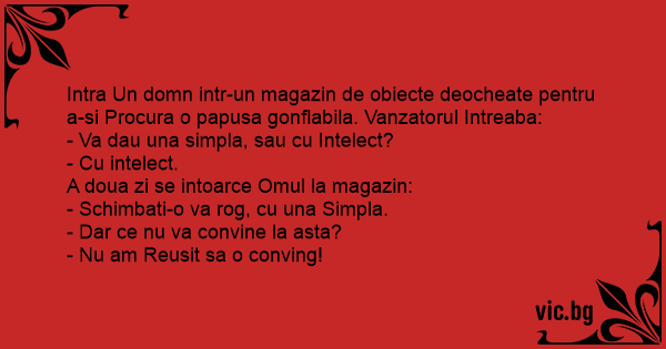 Intra Un domn intr-un magazin de obiecte deocheate pentru a-si Procura o papusa gonflabila. Vanzatorul Intreaba: