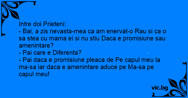 - Pai daca e promisiune pleaca de Pe capul meu la ma-sa iar daca e amenintare aduce pe Ma-sa pe capul meu!