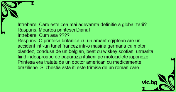 Raspuns: O printesa britanica cu un amant egiptean are un accident intr-un tunel francez intr-o masina germana cu motor olandez, condusa de un belgian, beat cu wiskey scotian, urmarita fiind indeaproape de paparazzi italieni pe motociclete japoneze. Printesa era tratata de un doctor american cu medicamente braziliene. Si chestia asta iti este trimisa de un roman care foloseste tehnologia lu'Bill Gates, iar tu o citesti pe o clona de IBM care foloseste cipuri taivaneze, cu monitor corean, asamblate de muncitori din Bangladesh intr-o fabrica din Singapore, transportata cu vapoare din India, si descarcata de sicilieni in porturi, trasportata din nou in camioane conduse de soferi mexicani si in final vanduta tie de evrei.