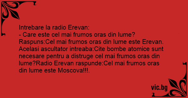 - Care este cel mai frumos oras din lume? Raspuns:Cel mai frumos oras din lume este Erevan. Acelasi ascultator intreaba:Cite bombe atomice sunt necesare pentru a distruge cel mai frumos oras din lume?Radio Erevan raspunde:Cel mai frumos oras din lume este Moscova!!!.