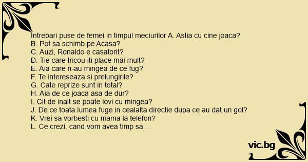 Intrebari puse de femei in timpul meciurilor A. Astia cu cine joaca?