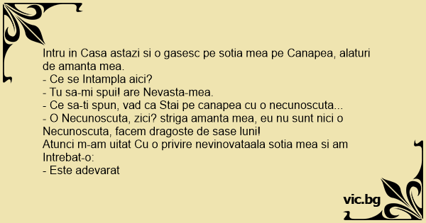 Intru in Casa astazi si o gasesc pe sotia mea pe Canapea, alaturi de amanta mea.