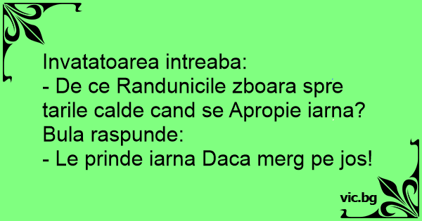 Invatatoarea intreaba:<br />- De ce Randunicile zboara spre tarile calde cand se Apropie iarna?<br />Bula raspunde:<br />- Le prinde iarna Daca merg pe jos!