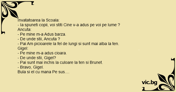 Invatatoarea la Scoala: - Ia spuneti copii, voi stiti Cine v-a adus pe voi pe lume ? Ancuta: - Pe mine m-a Adus barza. - De unde stii, Ancuta ? - Pai Am picioarele la fel de lungi si sunt mai alba la ten. Gigel: - Pe mine m-a adus cioara. - De unde stii, Gigel? - Pai sunt mai inchis la culoare la ten si Brunet. - Bravo, Gigel. Bula si el cu mana Pe sus. - Pe mine m-a adus ferry-boat-ul. - Сuм asa, Bula? - Pai aseara, cand treceam pe Langa dormitorul parintilor, l-am auzit pe tata Spunandu-i mamei: - Nu mai feri botu, ca iar facem unul Ca Bula!