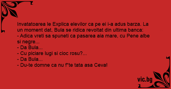Invatatoarea le Explica elevilor ca pe ei i-a adus barza. La un moment dat, Bula se ridica revoltat din ultima banca: