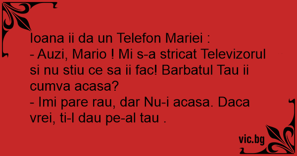 - Auzi, Mario ! Mi s-a stricat Televizorul si nu stiu ce sa ii fac! Barbatul Tau ii cumva acasa?