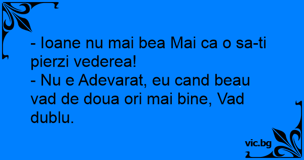 - Ioane nu mai bea Mai ca o sa-ti pierzi vederea!<br />- Nu e Adevarat, eu cand beau vad de doua ori mai bine, Vad dublu.