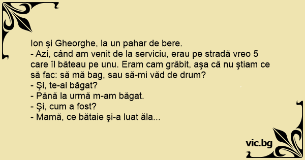 - Azi, când am venit de la serviciu, erau pe stradă vreo 5 care îl băteau pe unu. Eram cam grăbit, aşa că nu ştiam ce să fac: să mă bag, sau să-mi văd de drum?