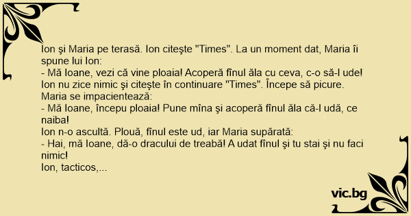 Ion nu zice nimic şi citeşte în continuare "Times". Începe să picure. Maria se impacientează:
