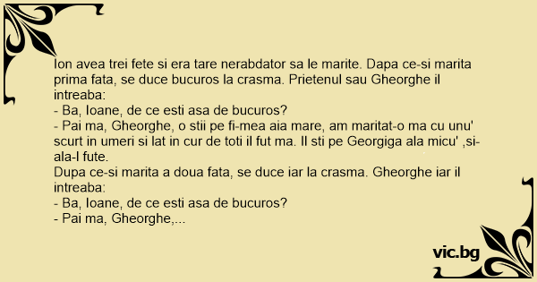 - Pai ma, Gheorghe, o stii pe fi-mea aia mare, am maritat-o ma cu unu' scurt in umeri si lat in cur de toti il fut ma. Il sti pe Georgiga ala micu' ,si-ala-l fute.