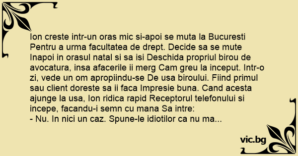 Ion creste intr-un oras mic si-apoi se muta la Bucuresti Pentru a urma facultatea de drept. Decide sa se mute Inapoi in orasul natal si sa isi Deschida propriul birou de avocatura, insa afacerile ii merg Cam greu la inceput. Intr-o zi, vede un om apropiindu-se De usa biroului. Fiind primul sau client doreste sa ii faca Impresie buna. Cand acesta ajunge la usa, Ion ridica rapid Receptorul telefonului si incepe, facandu-i semn cu mana Sa intre: