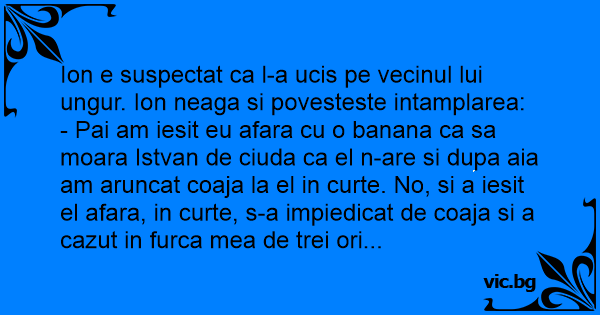- Pai am iesit eu afara cu o banana ca sa moara Istvan de ciuda ca el n-are si dupa aia am aruncat coaja la el in curte. No, si a iesit el afara, in curte, s-a impiedicat de coaja si a cazut in furca mea de trei ori...