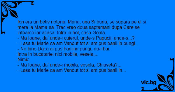 Ion era un betiv notoriu. Maria, una Si buna, se supara pe el si mere la Mama-sa. Trec vreo doua saptamani dupa Care se intoarce iar acasa. Intra in hol, casa Goala.