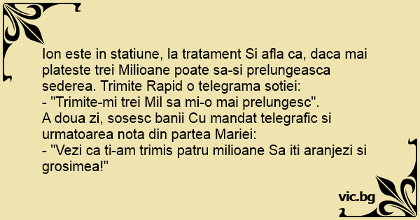 Ion este in statiune, la tratament Si afla ca, daca mai plateste trei Milioane poate sa-si prelungeasca sederea. Trimite Rapid o telegrama sotiei: