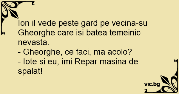 Ion il vede peste gard pe vecina-su Gheorghe care isi batea temeinic nevasta.