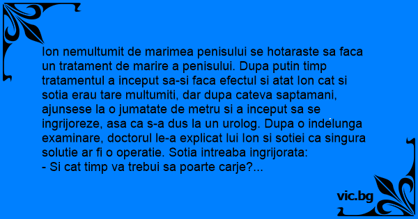 Ion nemultumit de marimea penisului se hotaraste sa faca un tratament de marire a penisului. Dupa putin timp tratamentul a inceput sa-si faca efectul si atat Ion cat si sotia erau tare multumiti, dar dupa cateva saptamani, ajunsese la o jumatate de metru si a inceput sa se ingrijoreze, asa ca s-a dus la un urolog. Dupa o indelunga examinare, doctorul le-a explicat lui Ion si sotiei ca singura solutie ar fi o operatie. Sotia intreaba ingrijorata: