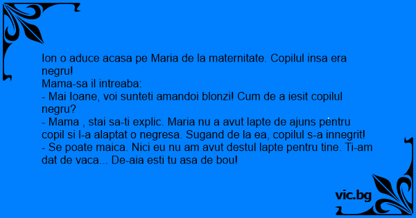- Se poate maica. Nici eu nu am avut destul lapte pentru tine. Ti-am dat de vаса... De-aia еsтi tu asa de bou!