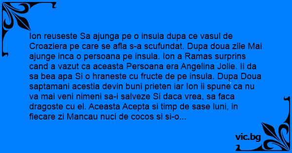 Ion reuseste Sa ajunga pe o insula dupa ce vasul de Croaziera pe care se afla s-a scufundat. Dupa doua zile Mai ajunge inca o persoana pe insula. Ion a Ramas surprins cand a vazut ca aceasta Persoana era Angelina Jolie. Ii da sa bea apa Si o hraneste cu fructe de pe insula. Dupa Doua saptamani acestia devin buni prieten iar Ion ii spune ca nu va mai veni nimeni sa-i salveze Si daca vrea, sa faca dragoste cu el. Aceasta Acepta si timp de sase luni, in fiecare zi Mancau nuci de cocos si si-o trageau. Cu fiecare zi Ce trecea, Ion devenea din ce in ce mai stresat, pana Intr-o zi cand ii spune Angelinei: