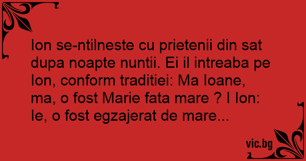 Ion se-ntilneste cu prietenii din sat dupa noapte nuntii. Ei il intreaba pe Ion, conform traditiei: Ma Ioane, ma, o fost Marie fata mare ? I Ion: Ie, o fost egzajerat de mare...