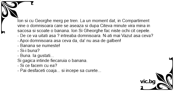 Ion si cu Georghe merg pe tren. La un moment dat, in Compartiment vine o domnisoara care se aseaza si dupa Citeva minute vira mina in sacosa si scoate o banana. Ion Si Gheorghe fac niste ochi cit cepele.