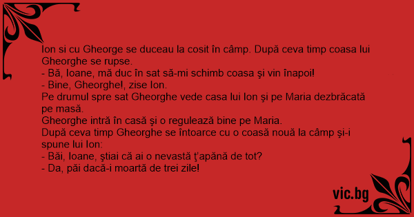 - Bă, Ioane, mă duc în sat să-mi schimb coasa şi vin înapoi!