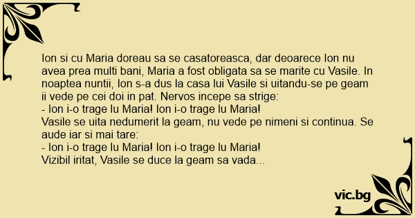 Ion si cu Maria doreau sa se casatoreasca, dar deoarece Ion nu avea prea multi bani, Maria a fost obligata sa se marite cu Vasile. In noaptea nuntii, Ion s-a dus la casa lui Vasile si uitandu-se pe geam ii vede pe cei doi in pat. Nervos incepe sa strige: