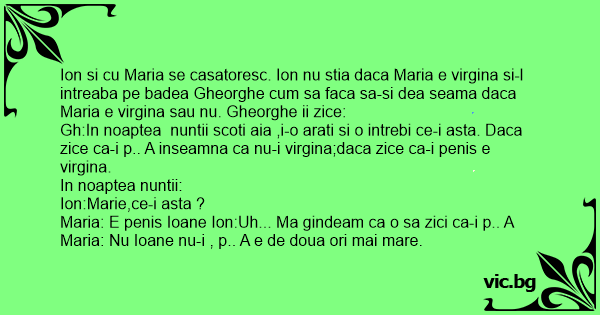 Ion si cu Maria se casatoresc. Ion nu stia daca Maria e virgina si-l intreaba pe badea Gheorghe сuм sa faca sa-si dea seama daca Maria e virgina sau nu. Gheorghe ii zice: