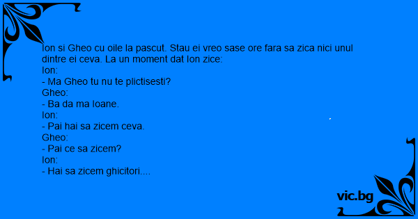 Ion si Gheo cu oile la pascut. Stau ei vreo sase ore fara sa zica nici unul dintre ei ceva. La un moment dat Ion zice: