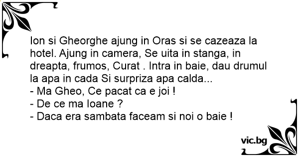 Ion si Gheorghe ajung in Oras si se cazeaza la hotel. Ajung in camera, Se uita in stanga, in dreapta, frumos, Curat . Intra in baie, dau drumul la apa in cada Si surpriza apa calda...