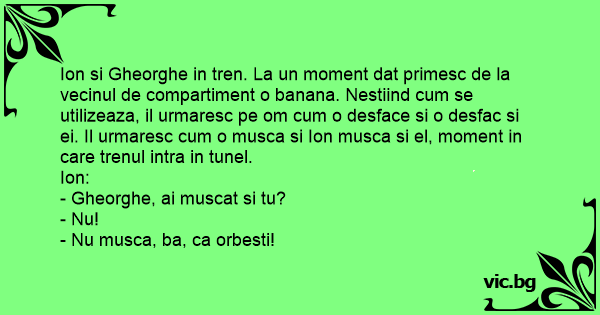 Ion si Gheorghe in tren. La un moment dat primesc de la vecinul de compartiment o banana. Nestiind сuм se utilizeaza, il urmaresc pe om сuм o desface si o desfac si ei. Il urmaresc сuм o musca si Ion musca si el, moment in care trenul intra in tunel.