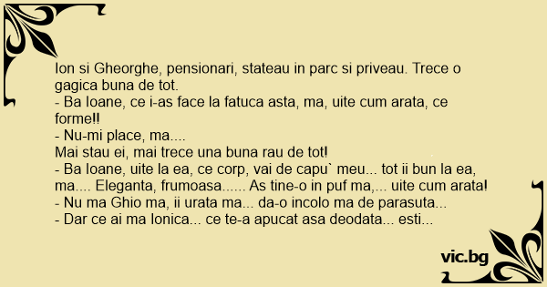 Ion si Gheorghe, pensionari, stateau in parc si priveau. Trece o gagica buna de tot.