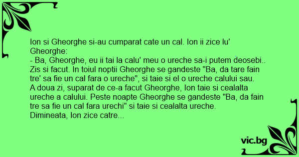 Ion si Gheorghe si-au cumparat cate un cal. Ion ii zice lu' Gheorghe: