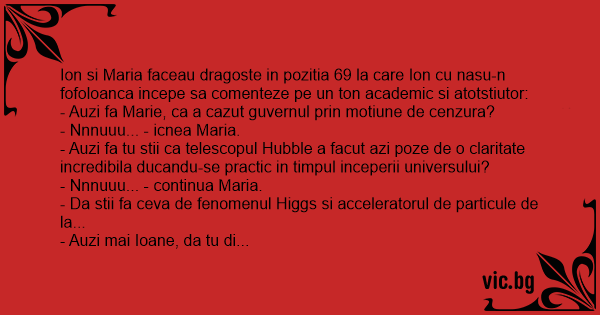 Ion si Maria faceau dragoste in pozitia 69 la care Ion cu nasu-n fofoloanca incepe sa comenteze pe un ton academic si atotstiutor: