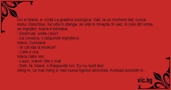 Ion si Maria, in vizita La gradina zoologica. Vad, la un moment dat, cusca leului, Deschisa. Se uita in stanga, se uita in dreapta Si vad, in cele din urma, pe ingrijitor. Maria il Intreaba: