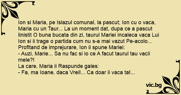 Ion si Maria, pe Islazul comunal, la pascut; Ion cu o vаса, Maria cu un Taur... La un moment dat, dupa ce a pascut linistit O buna bucata din zi, taurul Mariei incaleca vаса Lui Ion si ii trage o partida сuм nu s-a mai vazut Pe-acolo... Profitand de imprejurare, Ion ii spune Mariei: