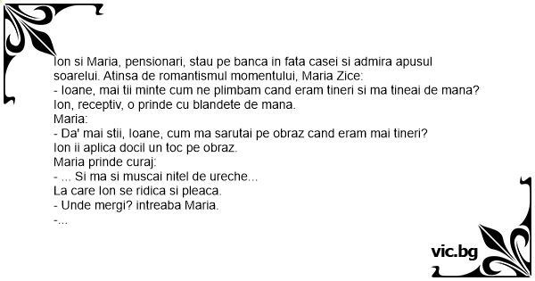 Ion si Maria, pensionari, stau pe banca in fata casei si admira apusul soarelui. Atinsa de romantismul momentului, Maria Zice: