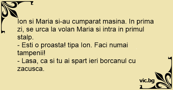 Ion si Maria si-au cumparat masina. In prima zi, se urca la volan Maria si intra in primul stalp.