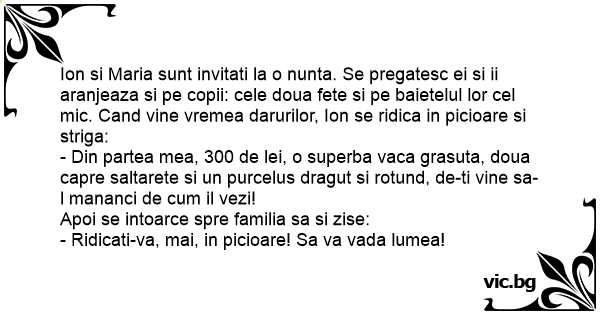 Ion si Maria sunt invitati la o nunta. Se pregatesc ei si ii aranjeaza si pe copii: cele doua fete si pe baietelul lor cel mic. Cand vine vremea darurilor, Ion se ridica in picioare si striga: