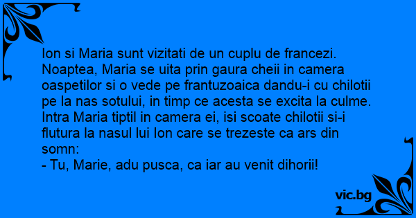 Ion si Maria sunt vizitati de un cuplu de francezi. Noaptea, Maria se uita prin gaura cheii in camera oaspetilor si o vede pe frantuzoaica dandu-i cu chilotii pe la nas sotului, in timp ce acesta se excita la culme. Intra Maria tiptil in camera ei, isi scoate chilotii si-i flutura la nasul lui Ion care se trezeste ca ars din somn: