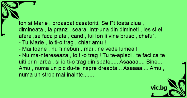 Ion si Marie , proaspat casatoriti. Se f*t toata ziua , dimineata , la pranz , seara. Intr-una din dimineti , ies si ei afara ,sa faca piata , cand , lui Ion ii vine brusc , chefu`.