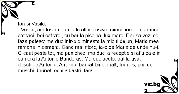 - Vasile, am fost in Turcia la all inclusive, exceptional: mananci cat vrei, bei cat vrei, cu bar la piscina, lux mare. Dar sa vezi ce faza patesc: ma duc intr-o dimineata la micul dejun, Maria mea ramane in camera. Cand ma intorc, ia-o pe Maria de unde nu-i. O caut peste tot, ma panichez, ma duc la receptie si aflu ca e in camera la Antonio Banderas. Ma duc acolo, bat la usa, deschide Antonio. Antonio, barbat bine: inalt, frumos, plin de мusсhi, brunet, ochi albastri, fara pic de burta. Cand colo, iese Maria mea dezbracata din baie! Cu tatele vai mama ei, curu lasat, cearcane... ba, mi-a fost o rusine de omul ala ...