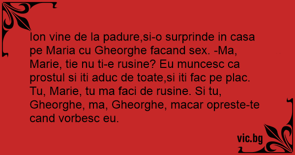 Ion vine de la padure,si-o surprinde in casa pe Maria cu Gheorghe facand sеx. -Ma, Marie, tie nu ti-e rusine? Eu muncesc ca prostul si iti aduc de toate,si iti fac pe plac. Tu, Marie, tu ma faci de rusine. Si tu, Gheorghe, ma, Gheorghe, macar opreste-te cand vorbesc eu.