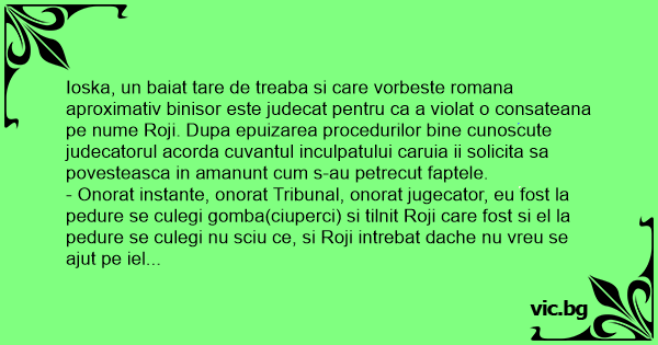 - Onorat instante, onorat Tribunal, onorat jugecator, eu fost la pedure se culegi gomba(ciuperci) si tilnit Roji care fost si el la pedure se culegi nu sciu ce, si Roji intrebat dache nu vreu se ajut pe iel se culegi virag( flori). Dracu care fost linghe mine venit si spus la mine in urece: