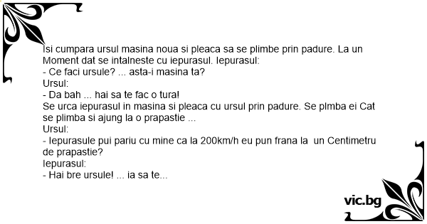 Se urca iepurasul la volan si incepe ... 100 .... 200 ... 300 km/h ... la un metru de Prapastie se uita la urs si-l intreaba Ursule te-ai pisat pe tine?