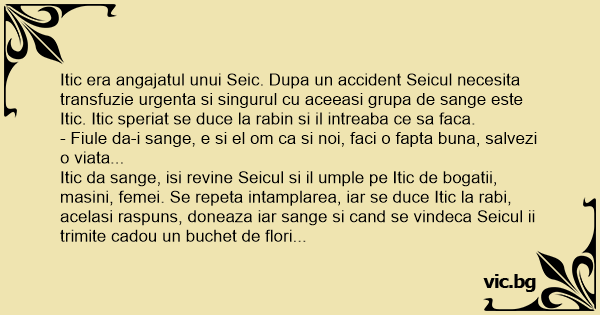 Itic da sange, isi revine Seicul si il umple pe Itic de bogatii, masini, femei. Se repeta intamplarea, iar se duce Itic la rabi, acelasi raspuns, doneaza iar sange si cand se vindeca Seicul ii trimite cadou un buchet de flori si o sticla cu vin. Se mira Itic, dar asta este! Se repeta a treia oara toata intamplarea, Seicul ii trimite de data asta numai o scrisoare de multumire. Itic foarte confuz se duce la rabin:
